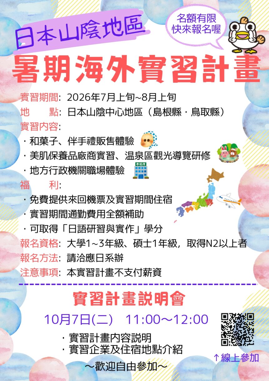 日本山陰地區暑假海外實習說明會 10/7(二)11點-12點 詳細資訊如圖 (如有課程無法參與說明會,可洽占部老師詢問)