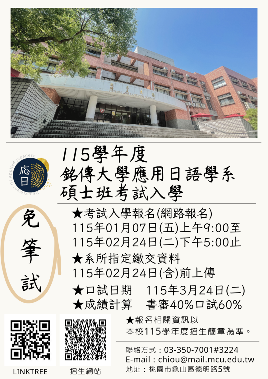 【系所公告】115學年度銘傳大學應用日語學系碩士班考試入學招生中