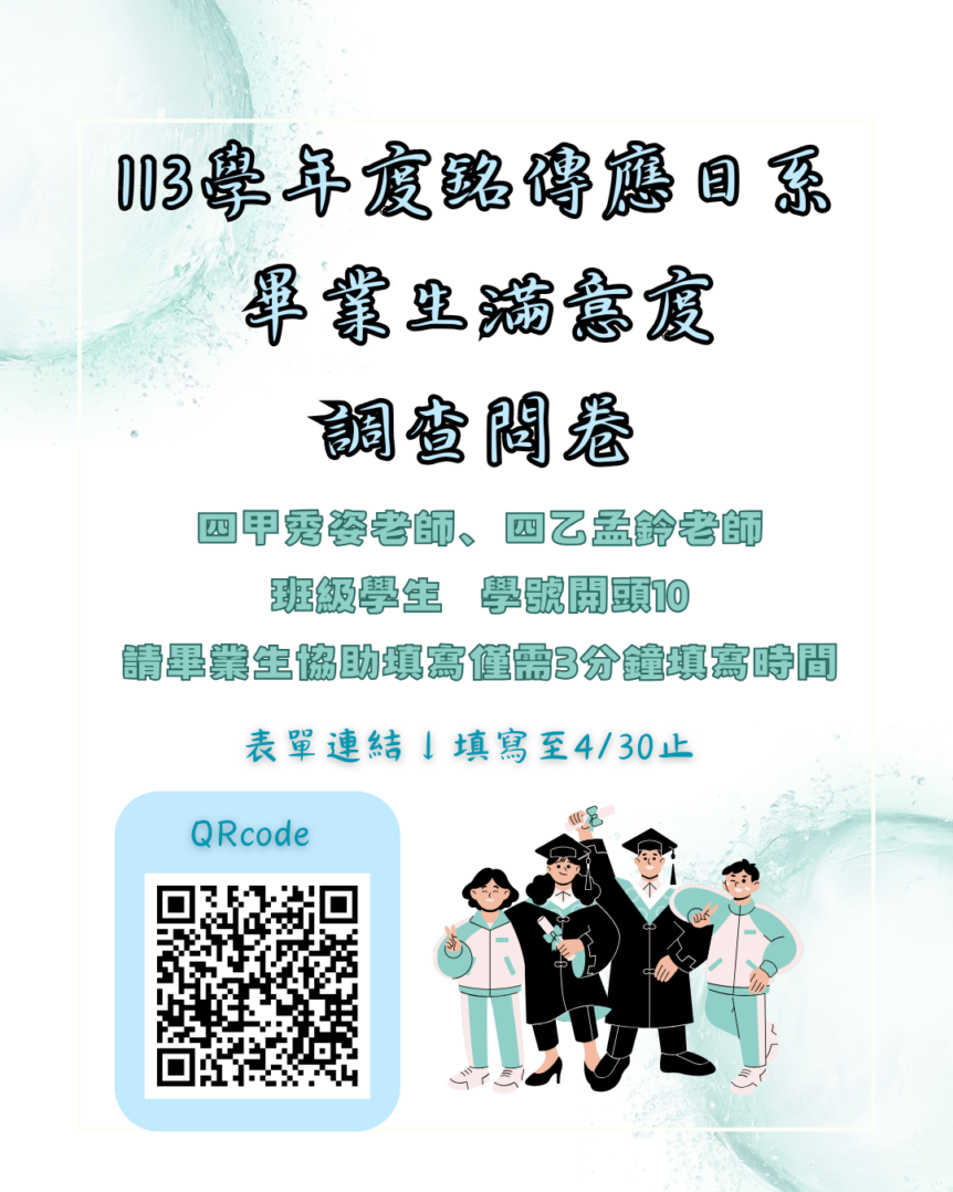 【系所公告】113學年度畢業生問卷調查 親愛的系友:您好! 本問卷調查之目的,係期望藉此瞭解系友對應用日語學系所之認同與 …